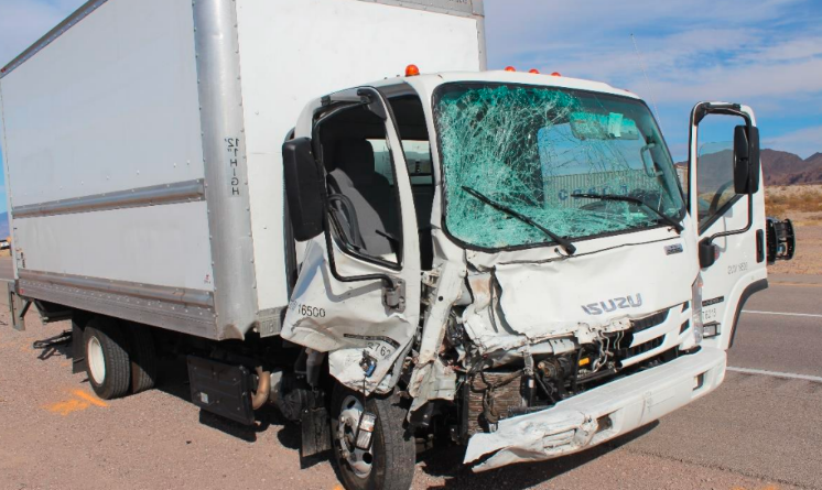 A motorist of this white box Isuzu truck drove the vehicle into a group of bicyclists Thursday along US highway 95 in Southern Nevada. Photo: Nevada Highway Patrol